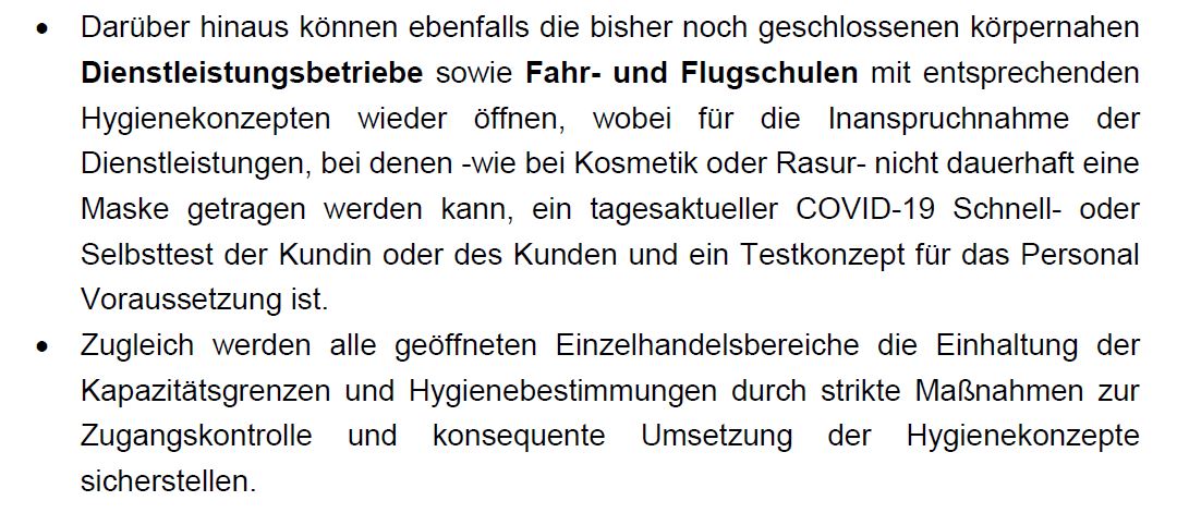 Laut dem jetzt vorliegenden Beschluss der „Bund-Länder-Konferenz“ sind „körpernahe Dienstleistungen“ ab Montag, dem 8. März 2021, wieder erlaubt und die Vorlage von Schnelltests ist „nur“ notwendig, wenn während der Dienstleistung die natürlich vorgeschriebene Maske abgesetzt werden muss, wie beispielsweise bei Rasur oder Gesichtskosmetik!