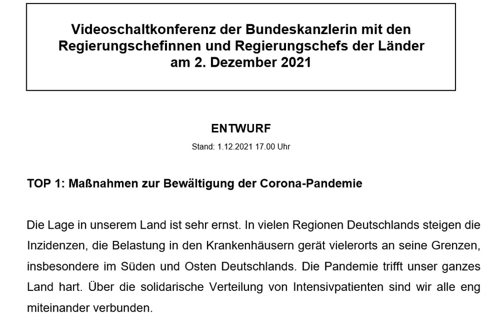 Die Tischvorlage für die heutige Konferenz der Ministerpräsidenten mit der Noch-Kanzlerin Angela Merkel und dem Bald-Kanzler Olaf Scholz.