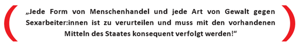 Wir Vertreterinnen und Vertreter der Rotlicht-Branche in Deutschland – als Bündnis für legale Prostitution – sprechen uns ebenso regelmäßig wie explizit gegen den Menschenhandel im allgemeinen und natürlich besonders gegen den Menschenhandel in unserer Branche aus.